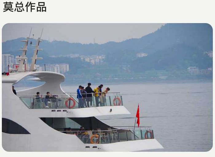 次日云淡风轻,登船游览,极目眺望,湖面水天一色,远山钟灵毓秀。云雾交相辉映,往复萦绕,恍惚之间,误入世外桃源,身陷人间仙境。游船纵横如梭,汽笛声声,劈波斩浪,伫立甲板,长空风啸,更觉山河壮丽。游人熙攘如织,喜形于色,神采奕奕,亦步亦趋,谈笑风生,顿添几分妩媚。老莫手持相机,眼观六格,青山绿水,红男绿女,尽成大作素材。
